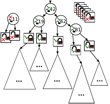 The actual items stored in the CA tree are located in sequential data structures in the bottom layer. These sequential data structures are protected by the locks in the base nodes in the middle layer. The base node locks have counters associated with them. The counter of a base node lock is increased when contention is detected in the base node lock and decreased when no such contention is detected. The value of this base node lock counter decides if a split or a join should happen after an operation has been performed in a base node. The routing nodes at the top of the picture above form a binary search tree that directs the search for a particular item. A routing node also contains a lock and a flag. These are used when joining base nodes. The details of how splitting and joining work will not be described in this article, but the interested reader can find a detailed description in this CA tree paper (preprint PDF). We will now illustrate how the CA tree changes its synchronization granularity by going through an example: