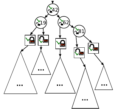 The synchronization granularity may differ in different parts of a CA tree if, for example, a particular part of a CA tree is accessed more frequently in parallel than the rest. The following picture shows the CA tree after yet another split: